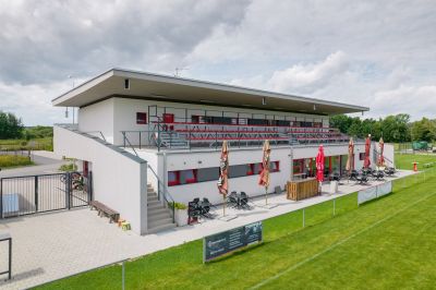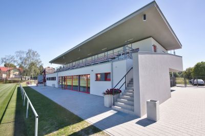Novostavba zázemí fotbalového klubu FC Dobřany s hledištěm, včetně nových travnatých hřišť s oplocením, zavlažováním, přidružených objektů (stánek, sklad, věž) a přístupových komunikací a parkovišť.