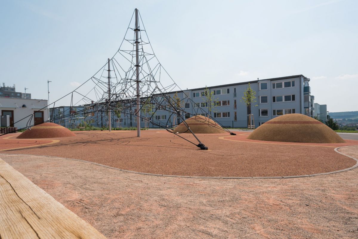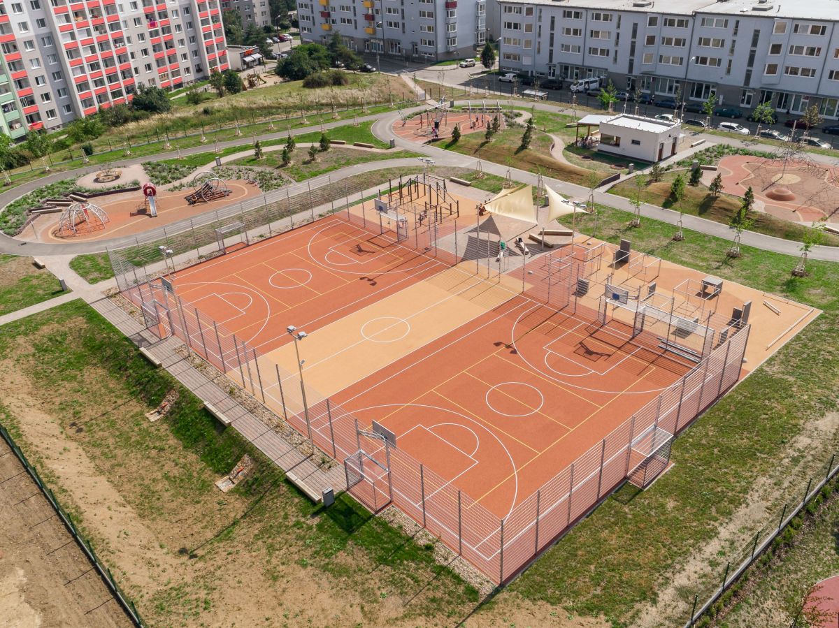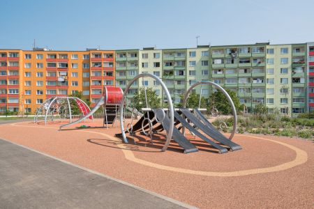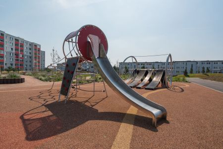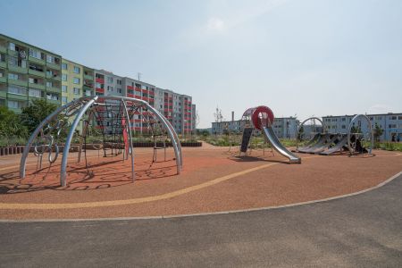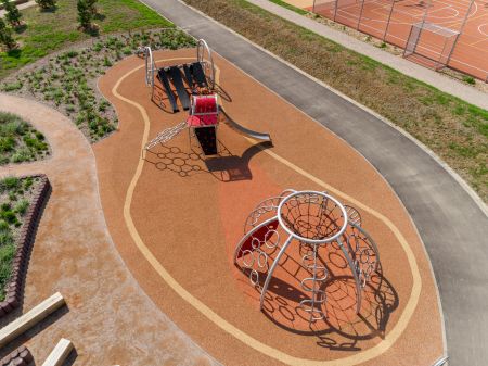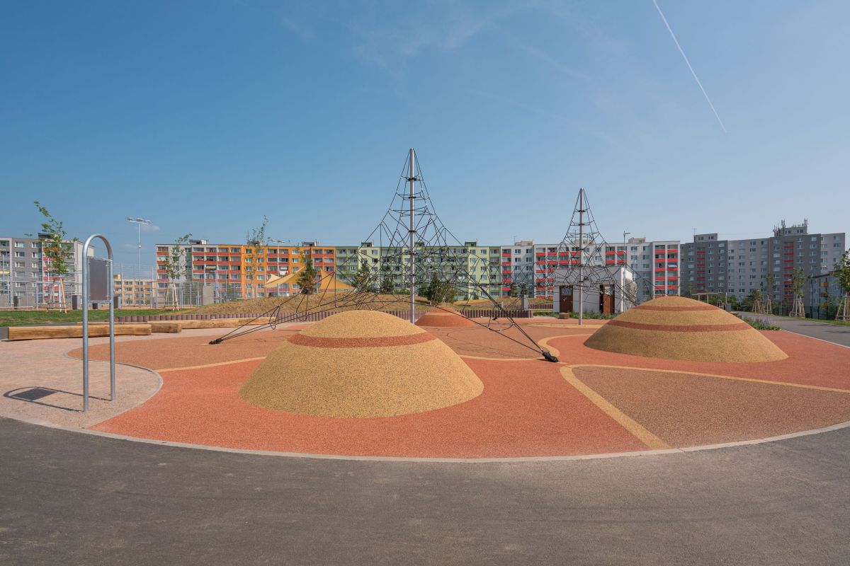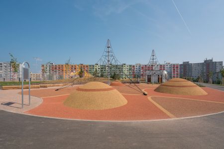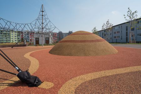 Realizace dětských hřišť s bezpečnostními PUR/EPDM povrchy, modulace umělých 3D herních atrakcí a barevné grafiky.