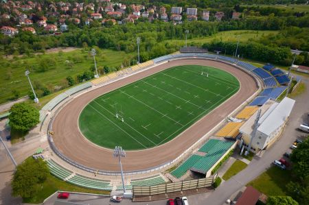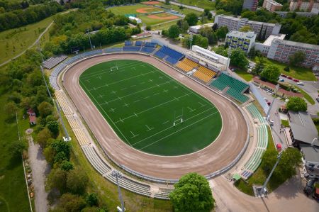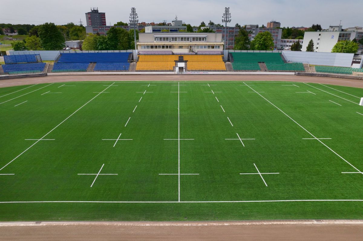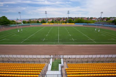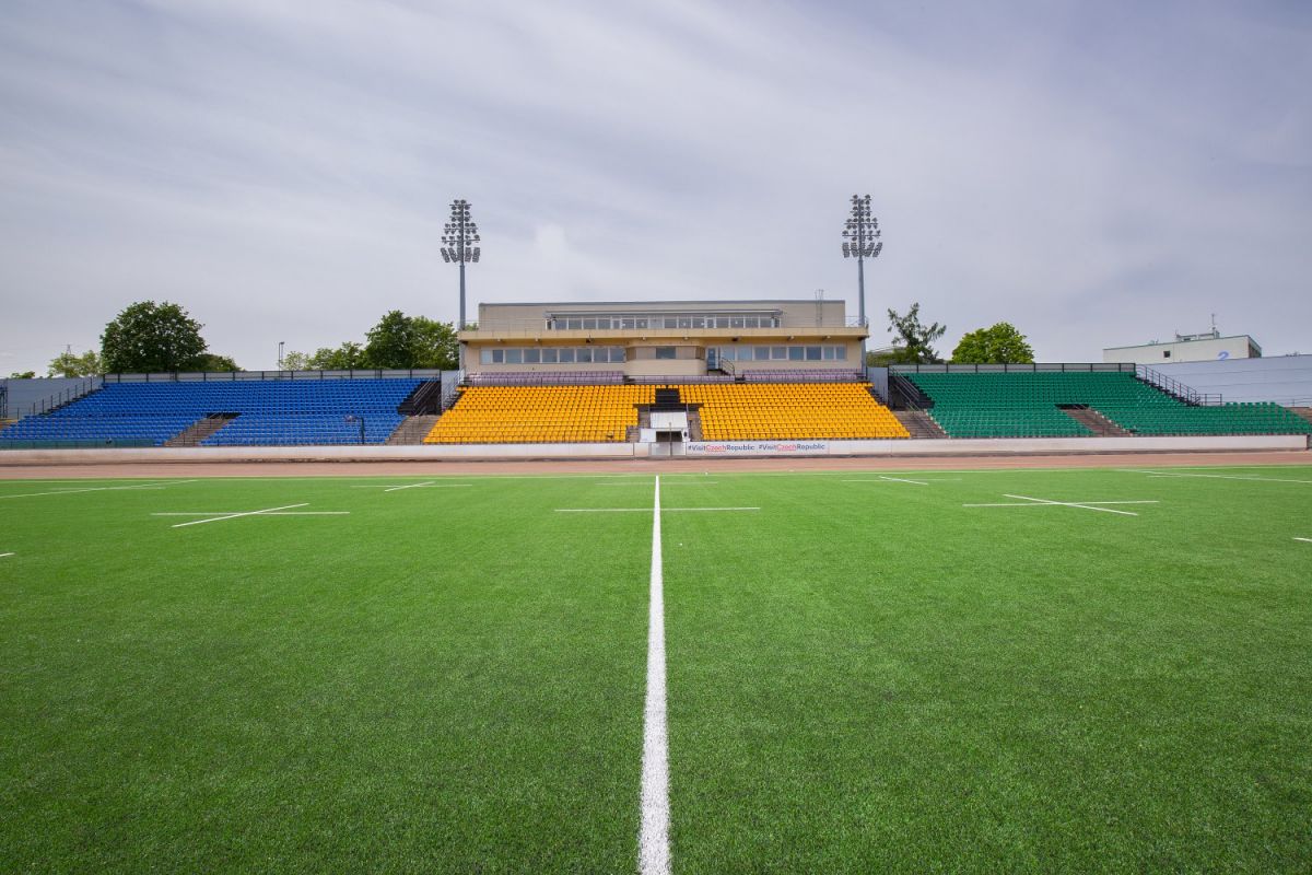 Rekonstrukce hřiště s umělým trávníkem 3. generace pro RUGBY. Realizace elastické podložky pod umělý trávník, zemních prací, podkladních štěrkových vrstev a drenážních asfaltů, realizace odvodnění ploch (drenáže, vsakovací jímky, akumulační nádrž), stabilizace zemní pláně. Realizace umělého LED osvětlení ploché dráhy, rugbyového hřiště (intenzita pro trénink 300lx, intenzita pro TV přenosy 1000lx) včetně demontáže stávajícího systému osvětlení. Realizace speciálního (hlubinného) zakládání stožárů osvětlení (velkoprůměrové piloty, mikropiloty), ozvučení areálu. Dodávka a montáž dieselagregátu, sportovního vybavení, renovace ploché dráhy, závlahového systému ploché dráhy a rugbyového hřiště.
