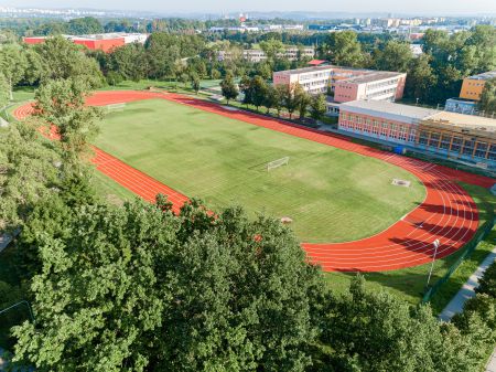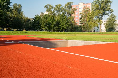 Opravy polyuretanových povrchů stříkaným retopingem. Lokální opravy litých pryžových povrchů včetně následného lajnování atletické dráhy. Vytvoření betonového odvodňovacího žlabu a další drobnější úpravy.