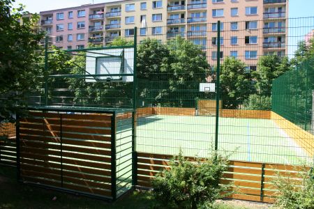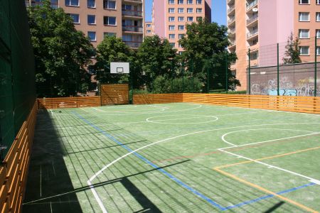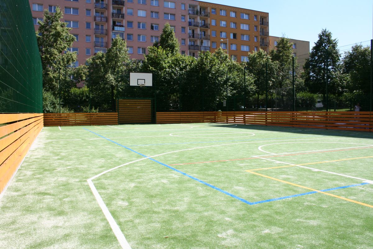 Realizace multifunkčního hřiště s povrchem z umělého trávníku včetně lajnování a dodání sportovního vybavení.