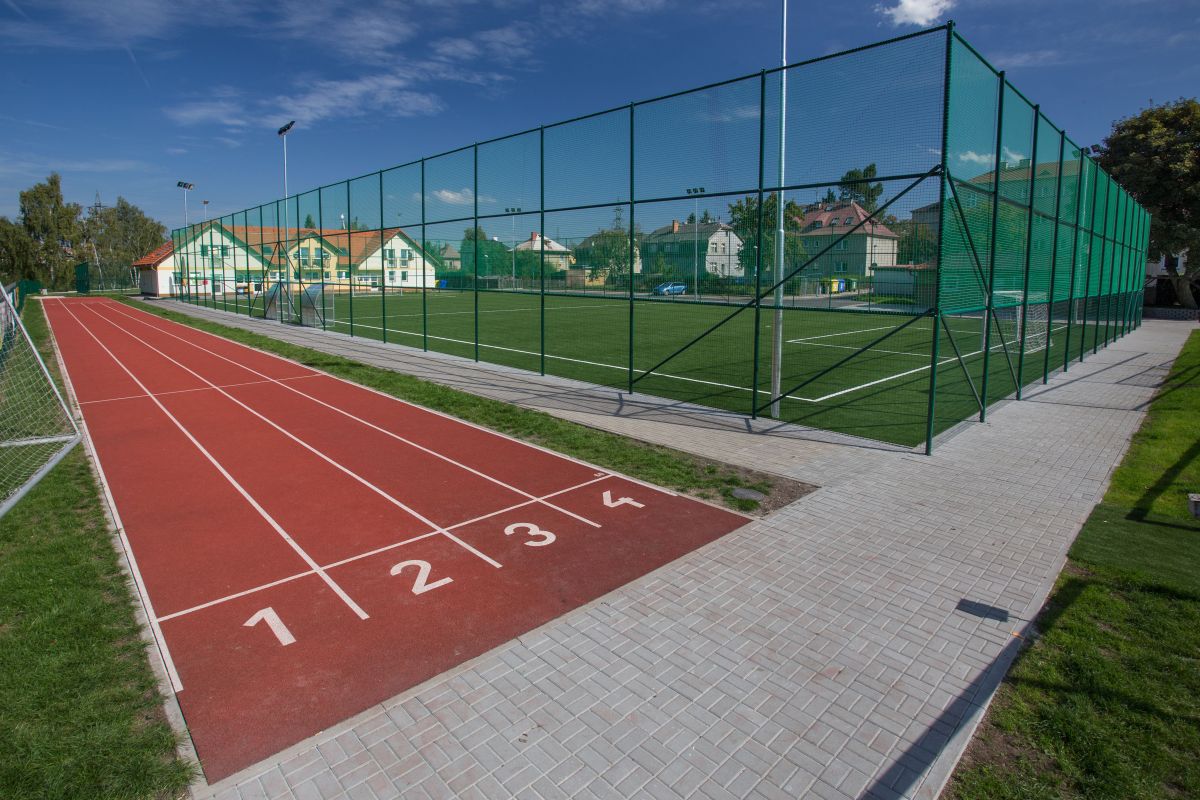Realizace víceúčelového hřiště s polyuretanovým povrchem, fotbalového hřiště s povrchem z bezzásypového umělého trávníku, běžecké rovinky s polyuretanovým povrchem a dodávka a instalace herních prvků na dětské hřiště včetně mobiliáře.