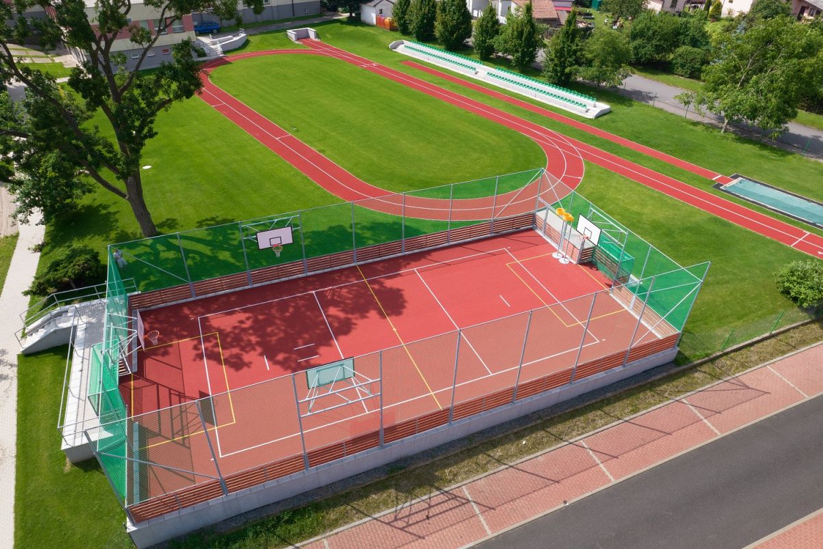 Realizace multifunkčního hřiště z EPDM povrchu včetně syntetického asfaltu (elastická podložka), podkladních vrstev, odvodňovacích žeber, opěrné stěny, sportovního vybavení, lajnování, oplocení z ocelových konstrukcí, dřevěných mantinelů a polypropylenové sítě. Součástí stavby je realizace běžeckého oválu z atletického vodopropustného povrchu včetně syntetického asfaltu (elastická podložka), podkladních vrstev, odvodňovacích žeber a lajnování, realizace rozběhové dráhy pro skok daleký z atletického vodopropustného povrchu včetně syntetického asfalstu (elastická podložka), podkladních vrstev, odvodňovacího žebra, sportovního vybavení, čistící zóny a písku, realizace železobetonové tribuny včetně sedaček, fotbalového hřiště z přírodního trávníku včetně podkladních vrstev, odvodňovacích žeber, závlahového systému a akumulačních nádrží.