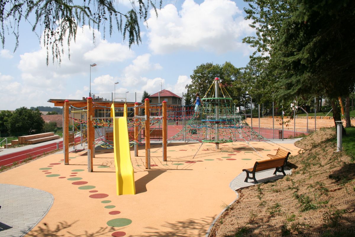 Realizace víceúčelového hřiště a atletické dráhy včetně pokládky umělých sportovních povrchů. Součástí stavby je i dodávka a montáž sportovního vybavení, pokládka umělých bezpečnostních litých povrchů na dětském hřišti a dodávka s montáží herních prvků včetně fitness okruhu a mobiliáře.