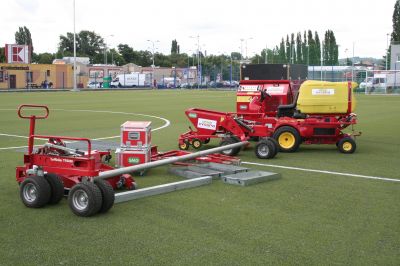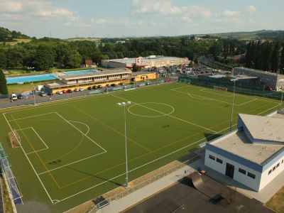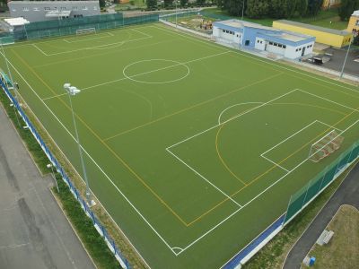 Rekonstrukce hřiště s umělým trávníkem 3. generace pro RUGBY. Realizace elastické podložky pod umělý trávník, zemních prací, podkladních štěrkových vrstev a drenážních asfaltů, realizace odvodnění ploch (drenáže, vsakovací...