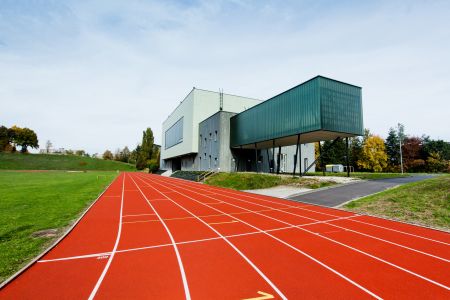 Realizace sportovní podlahy pro atletiku včetně lajnování a dodávky 3 ks pásů Regupol Runway.