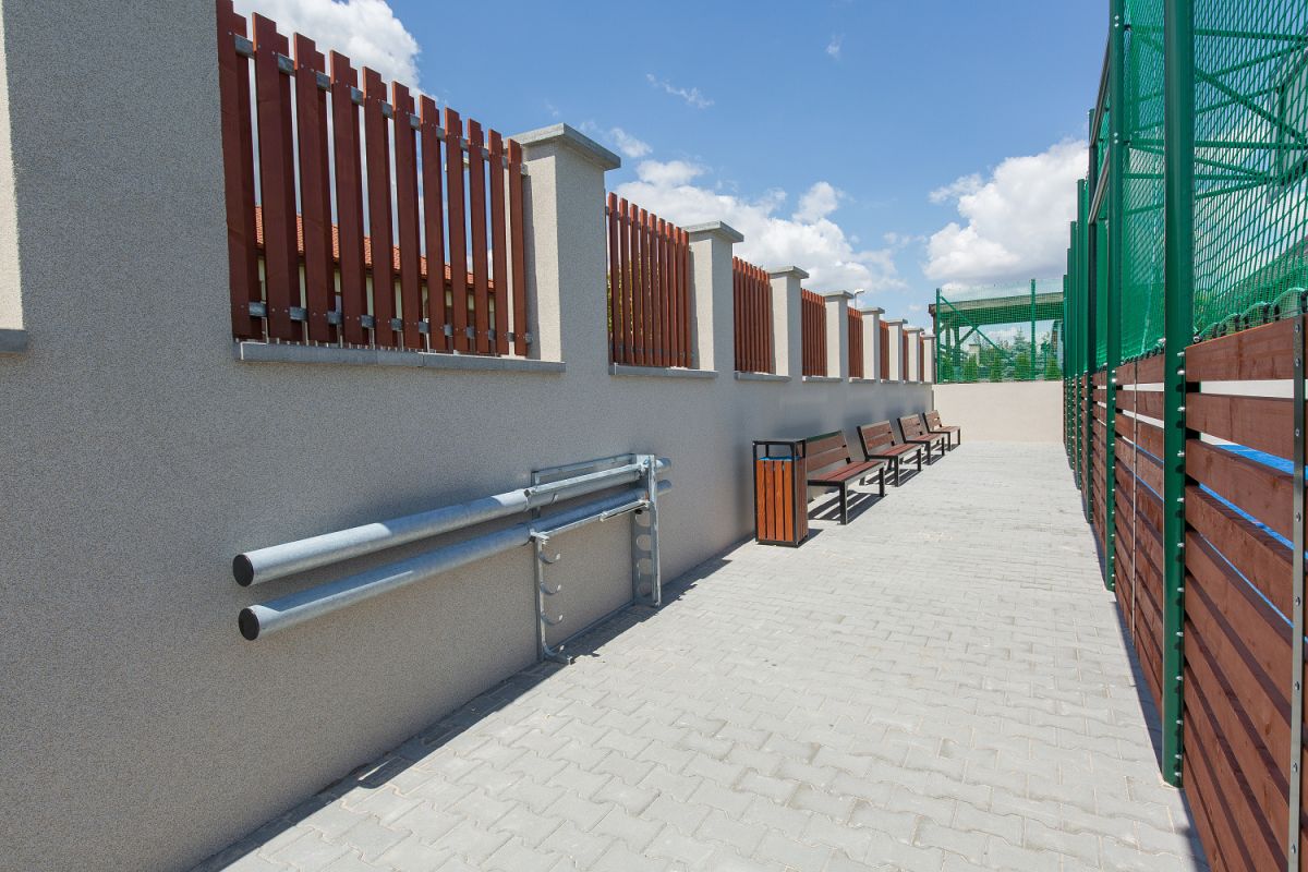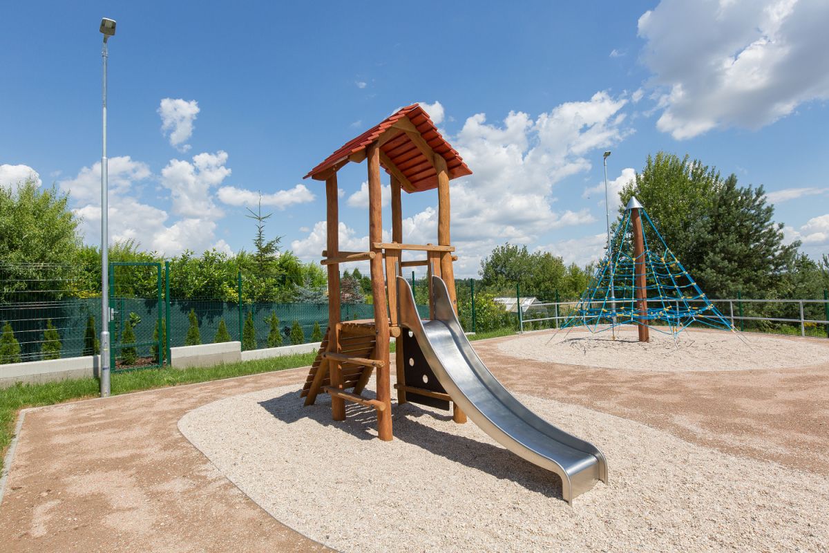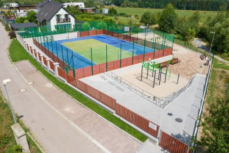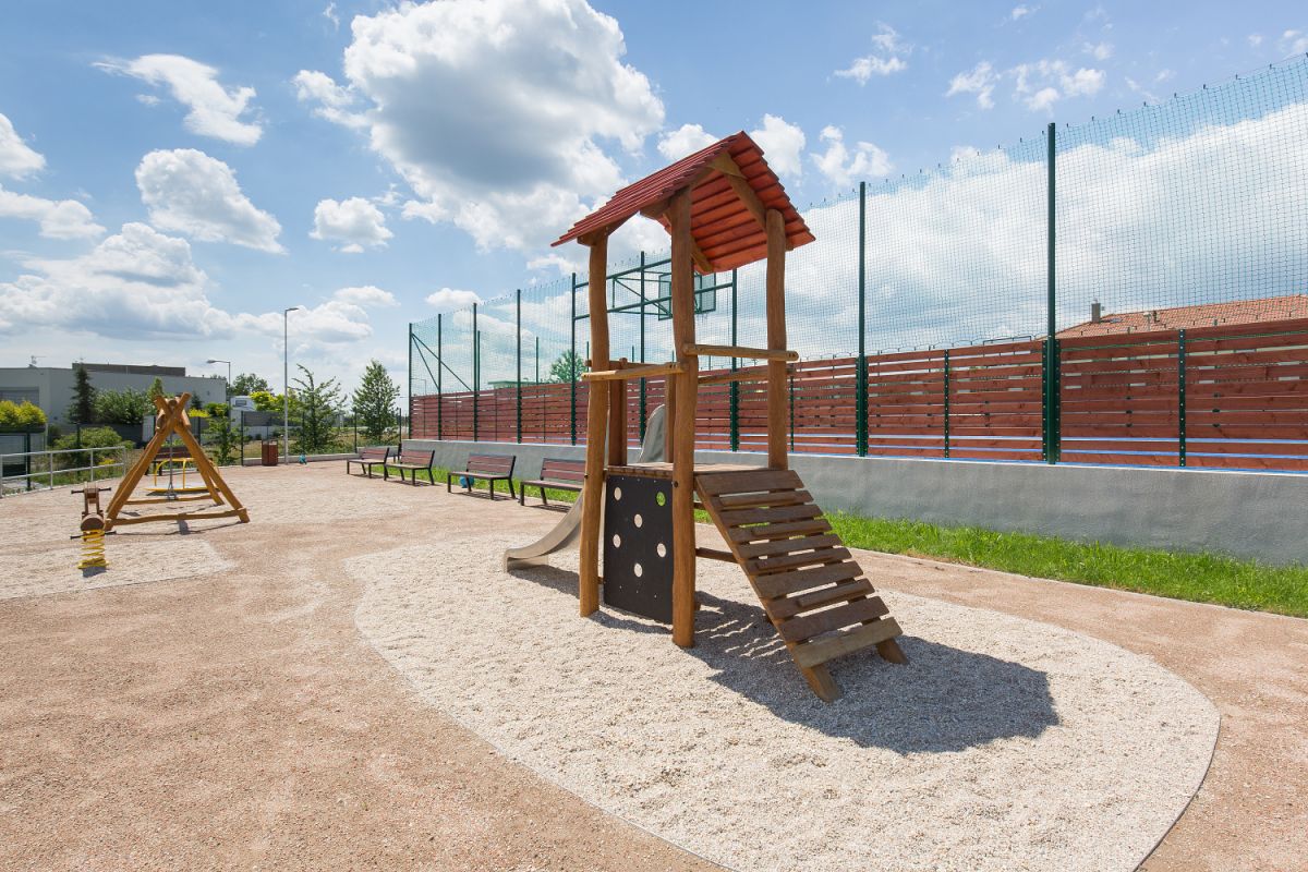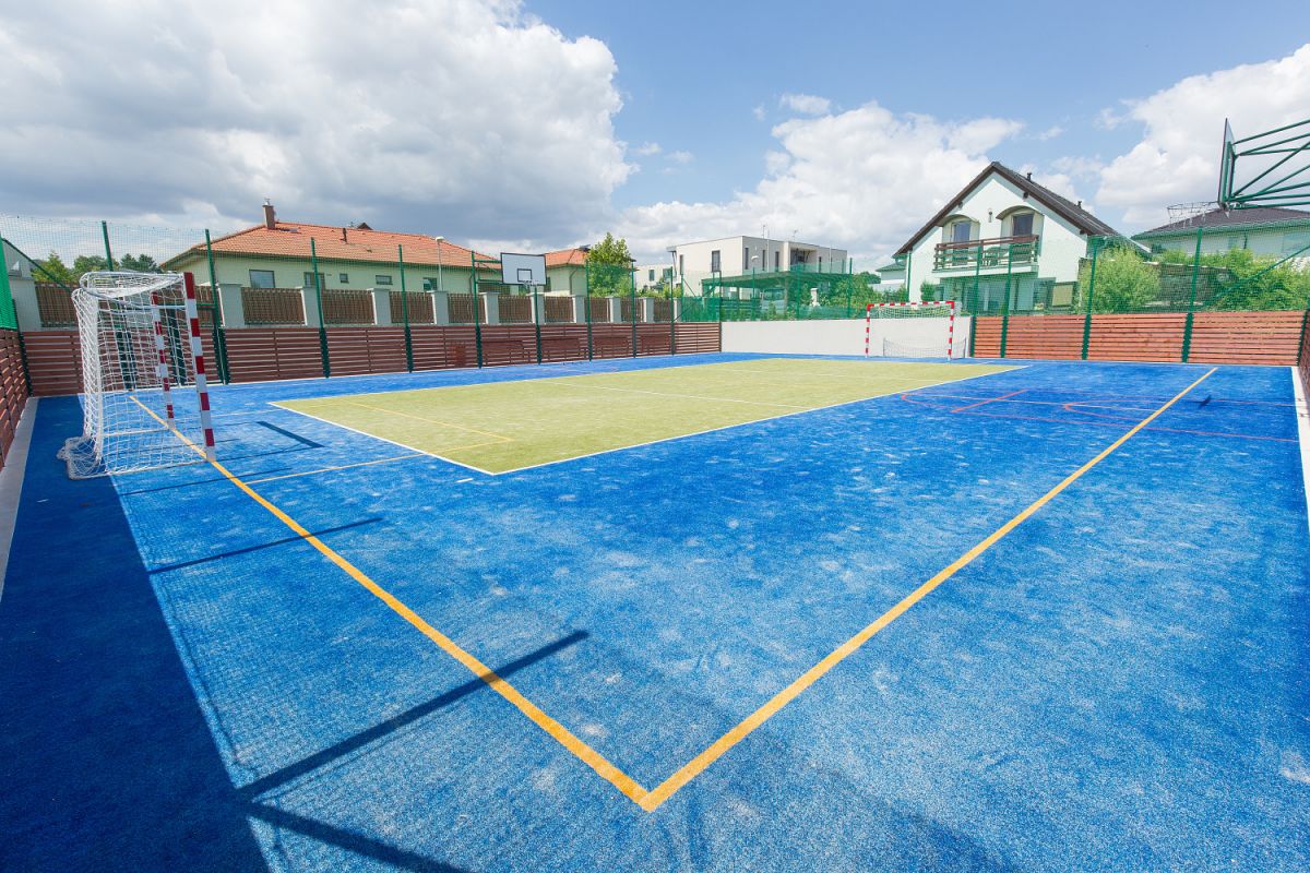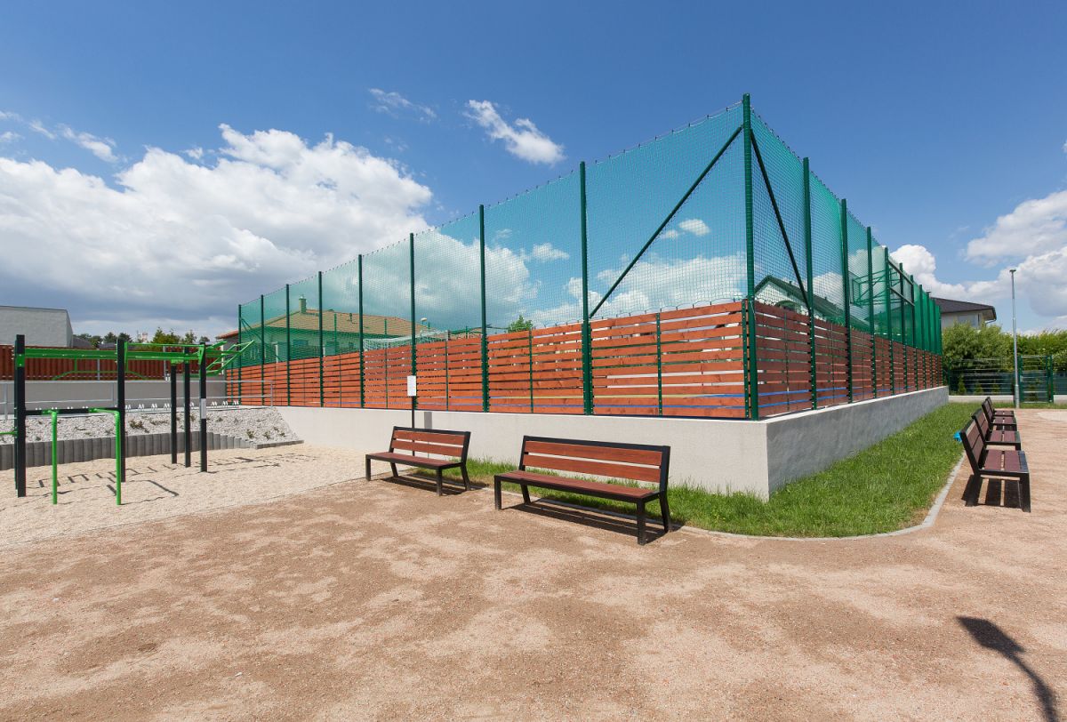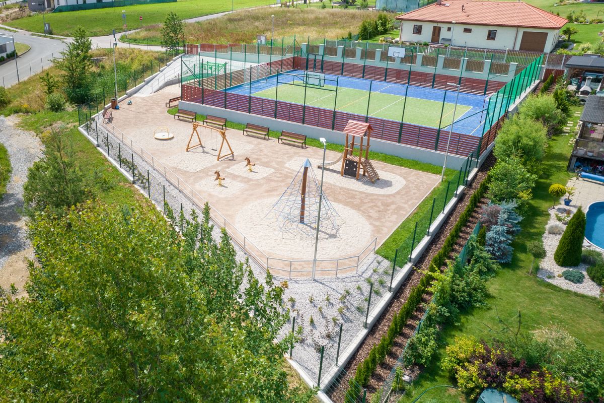 Výstavba víceúčelového hřiště s umělým trávníkem včetně štěrkových podkladních vrstev, odvodnění, elastické podložky, sportovního vybavení, oplocení s mantinelem a ochranné sítě. Součástí stavby je vodovodní přípojka, osvětlení areálu, zábradlí, areálové oplocení, mobiliář a opěrné stěny. Kolem hřiště jsou vybudovány zpevněné plochy ze zámkové dlažby. Součástí stavby je také dodávka a montáž herních prvků a workoutové sestavy včetně bezpečnostních dopadových ploch.