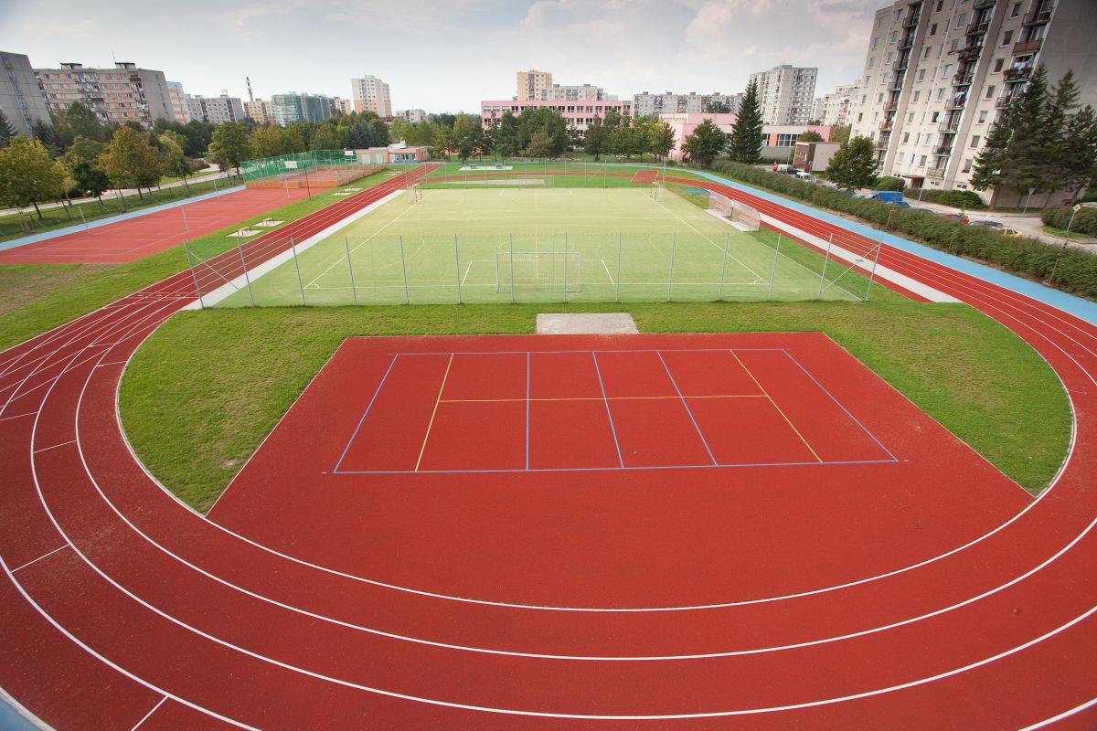Kompletní rekonstrukce školního sportovního areálu, pokládka PUR povrchů na atletickou dráhu a multifunkční hřiště, dodávka a pokládka umělého trávníku na hřiště malé kopané, dodávka a pokládka akrylátové stěrky na in-line dráhu a oplocení hřišť.